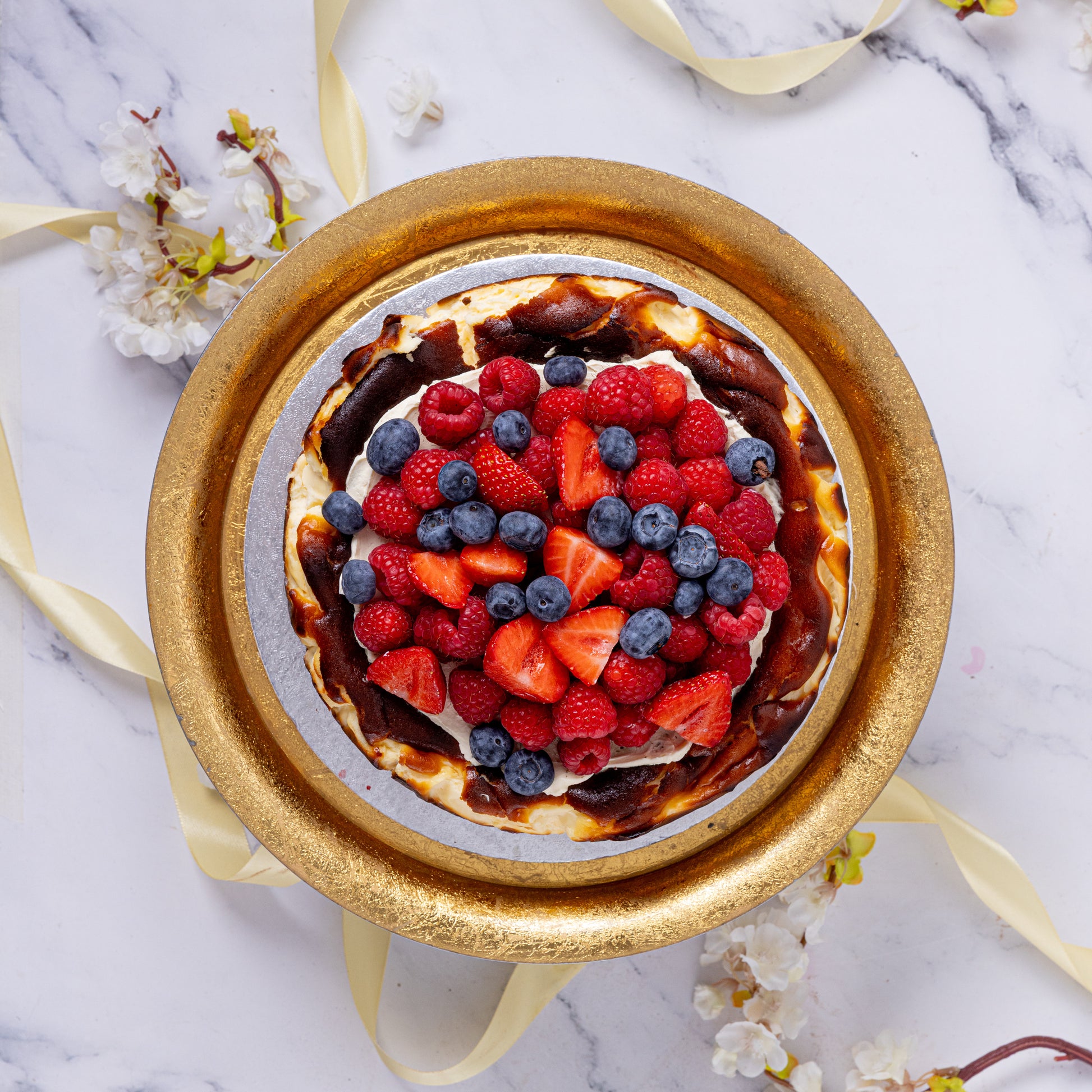 Our signature Basque Burnt Cheesecake gets a vibrant twist, topped with a layer of light mascarpone and cream cheese frosting and a colourful medley of ripe, juicy berries for a burst of freshness in every bite. Naturally gluten free and beautifully balanced with a caramelised top and velvety centre, it’s equally suited to elegant desserts or celebratory centrepieces.
