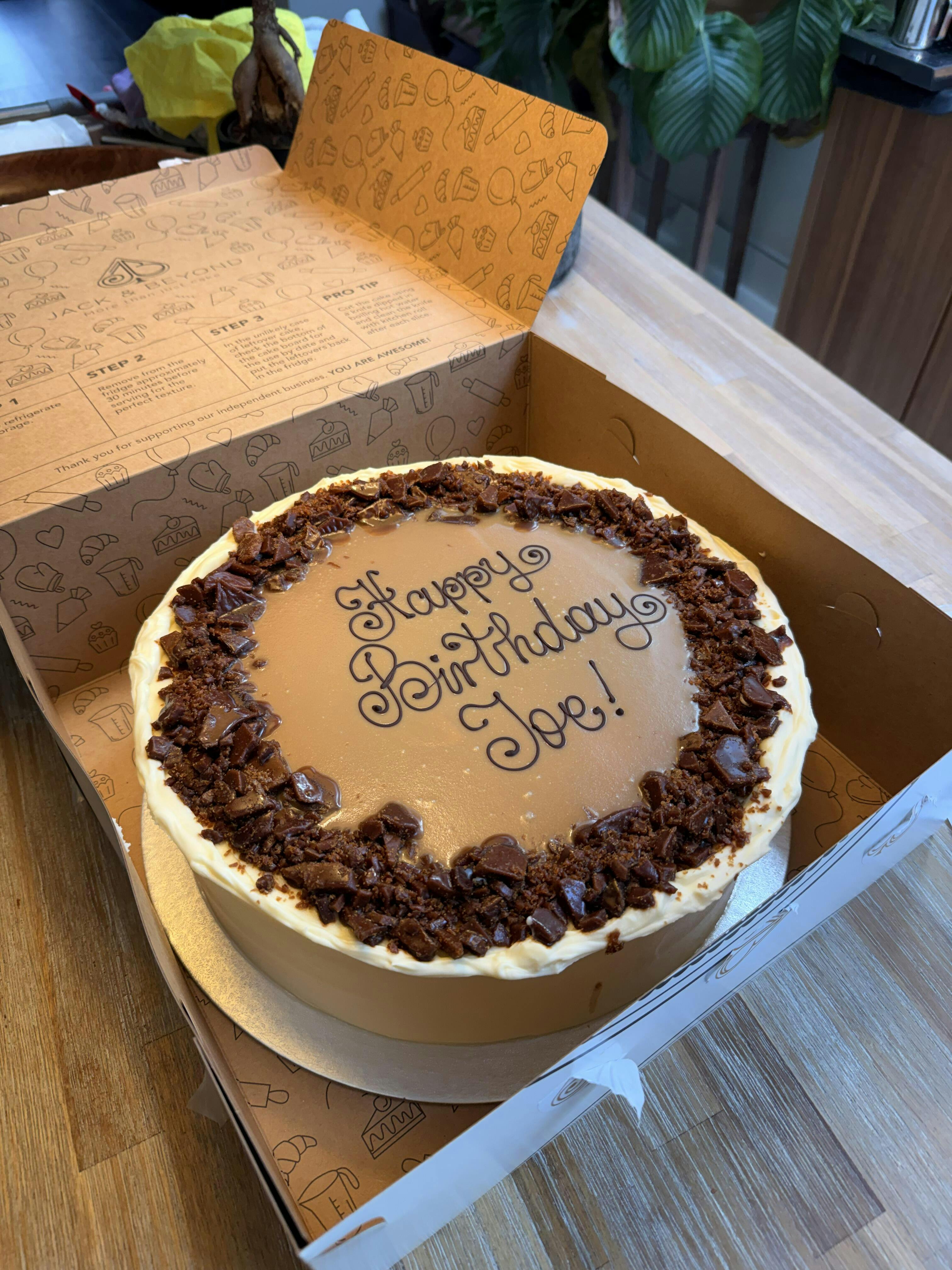 This delightful cake creation is inspired by the beloved British dessert and consists of scrumptious date & treacle sponge layers with smooth vanilla frosting and a rich toffee sauce. A great choice for birthdays or any special event or occasion.
