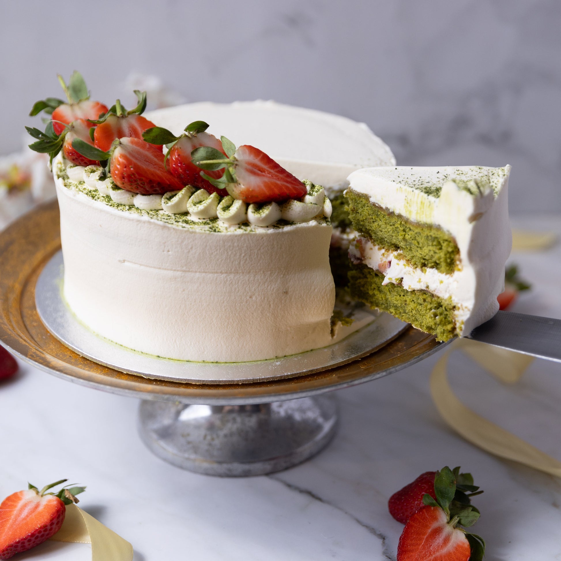 This stunning Celebration Cake is a delight, visually and flavourwise! Light matcha sponges are paired with fresh strawberries and fresh cream frosting, finished with an elegant design.