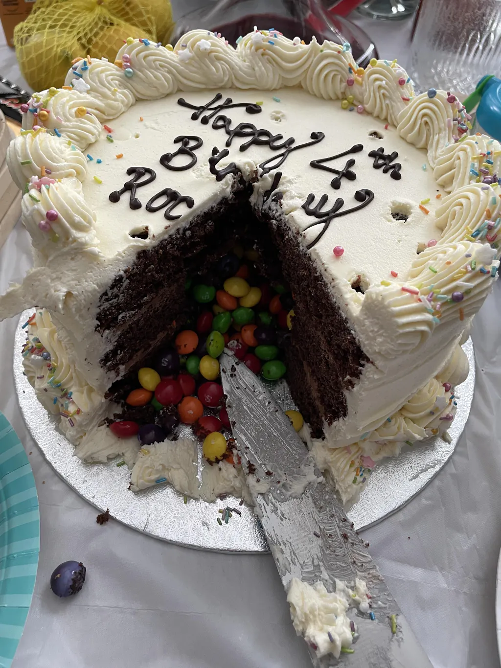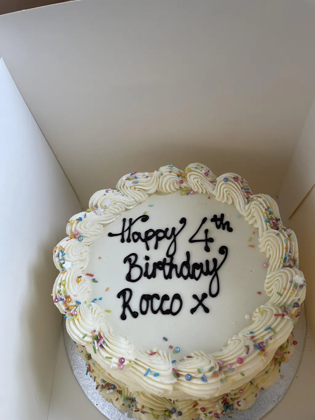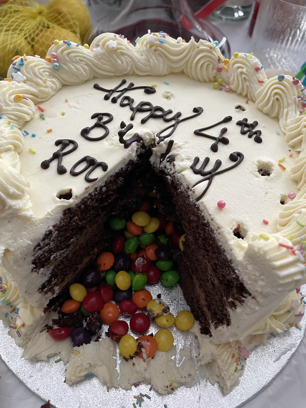 Very pretty cake. I thought the surprise contents were smarties but was even more pleased they were skittles. Everyone enjoyed the cake. Always neatly boxed and well presented! I would just recommend adding slightly more flavouring but otherwise loved it! Thank you 🙏