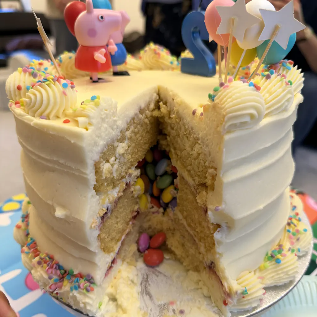 The magic happens when you cut the first slice: hidden smarties and skittles tumble out of the sponge layers for a fun piñata-style reveal that’s guaranteed to delight guests. Each cake features three fluffy sponge layers, covered in our signature vanilla mascarpone frosting and finished with cheerful rainbow sprinkles.