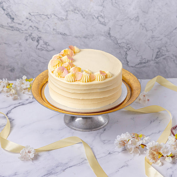 Our cake is generously covered in silky vanilla frosting, made with the finest British dairy for a smooth, melt-in-the-mouth finish. A vegan option is also available, filled and coated with delicious plant-based vanilla buttercream.